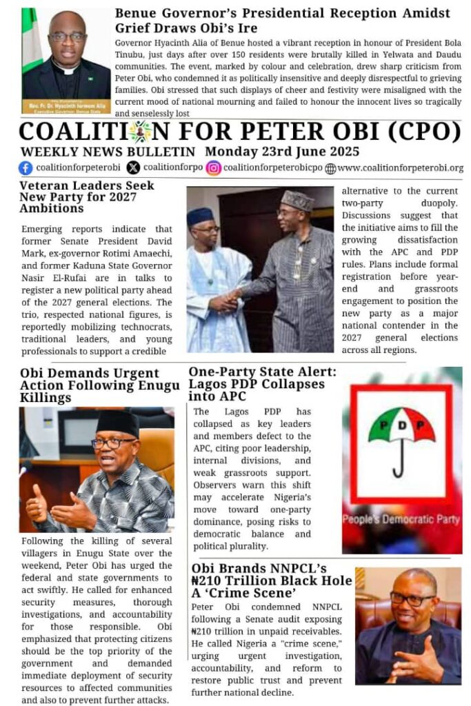 Obidient NEWS… A Weekly News Bulletin of COALITION FOR PETER OBI – CPOBy Coalition for Peter Obi / June 23, 2025 For more Newswww.coalitionforpo.org